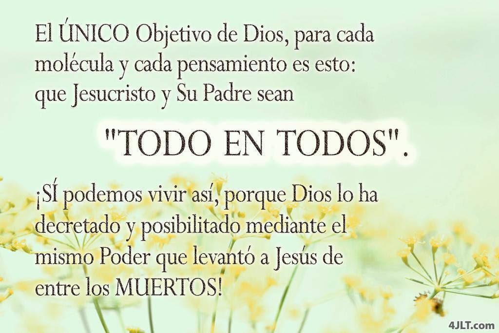 El ÚNICO Objetivo de Dios, para cada molécula y cada pensamiento es esto: que Jesucristo y Su Padre sean "TODO EN TODOS". ¡SÍ podemos vivir así, porque Dios lo ha decretado y posibilitado mediante el mismo Poder que levantó a Jesús de entre los MUERTOS!